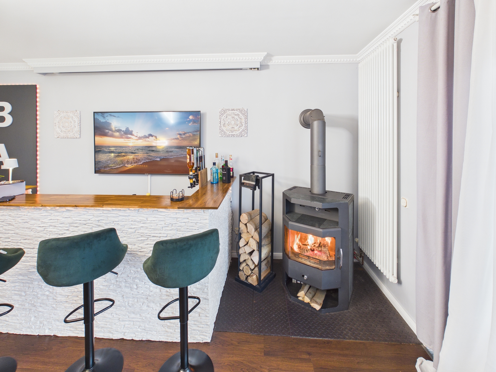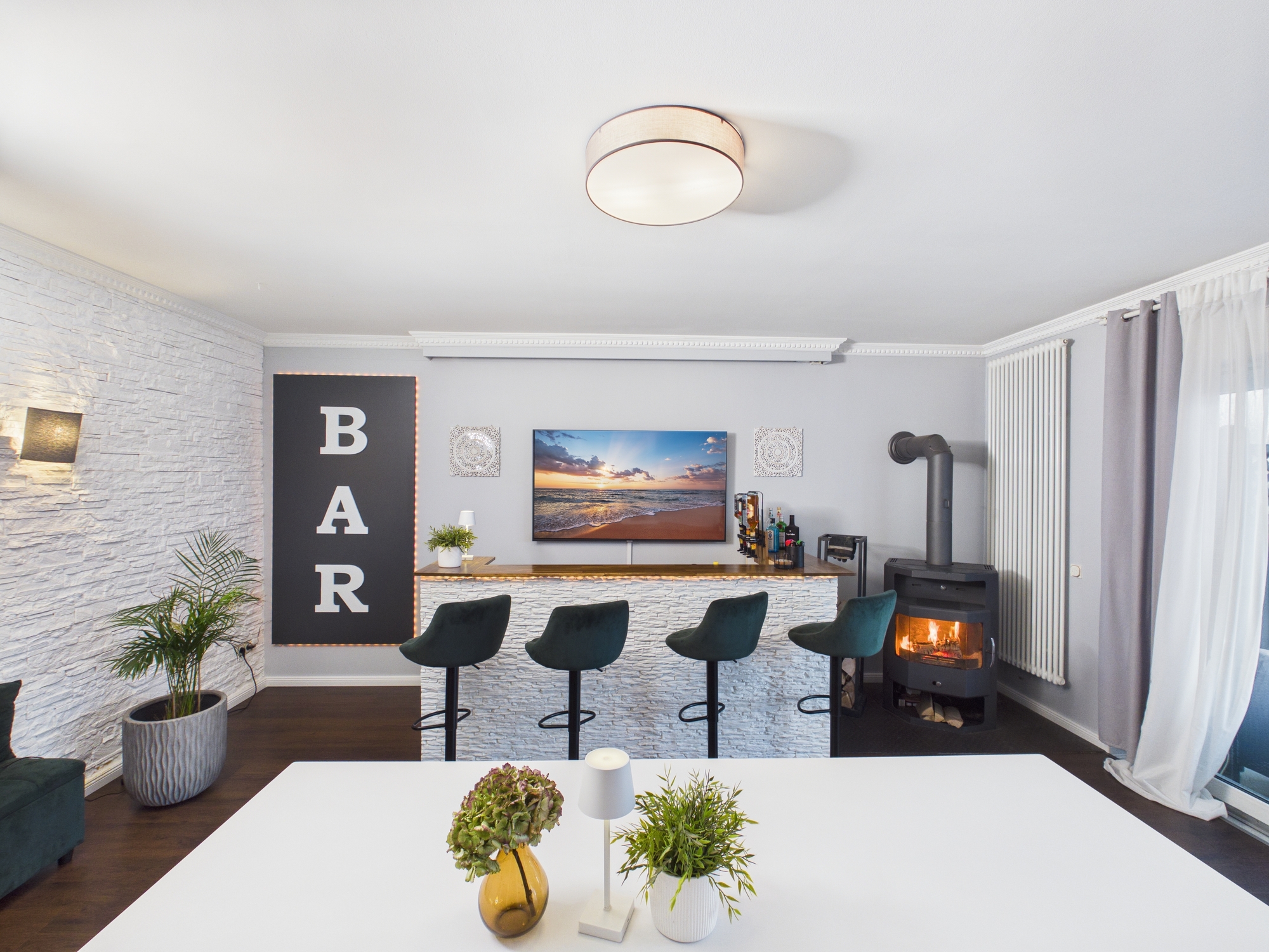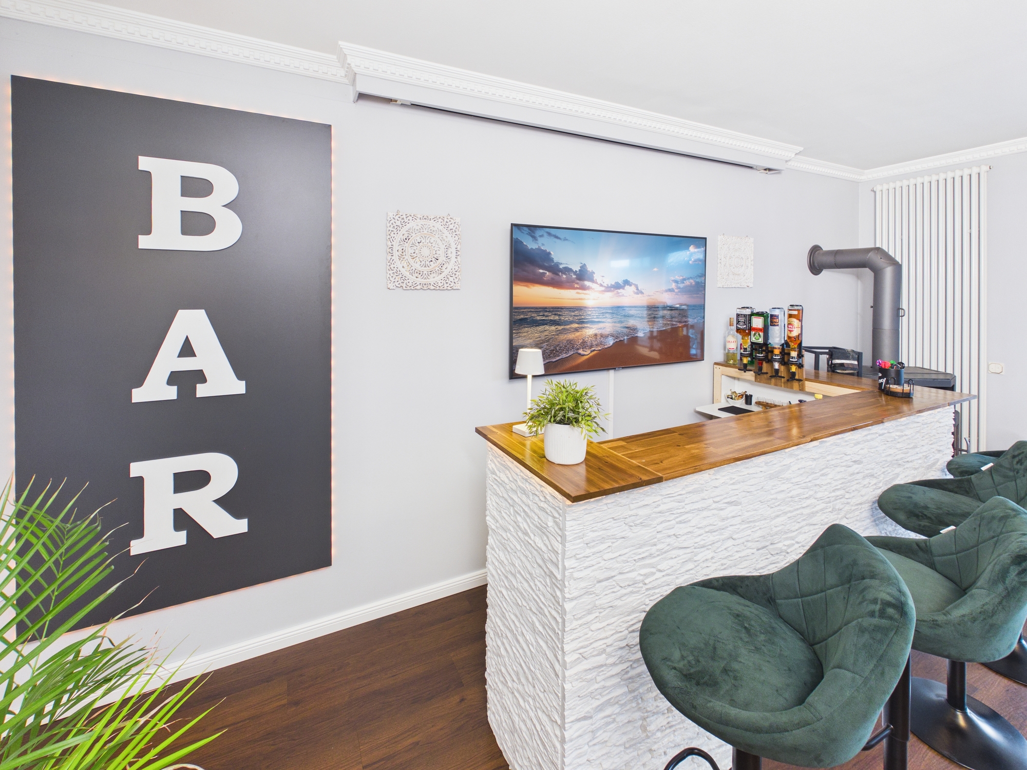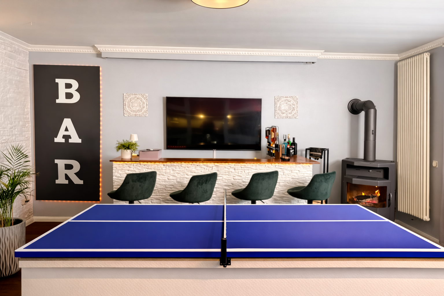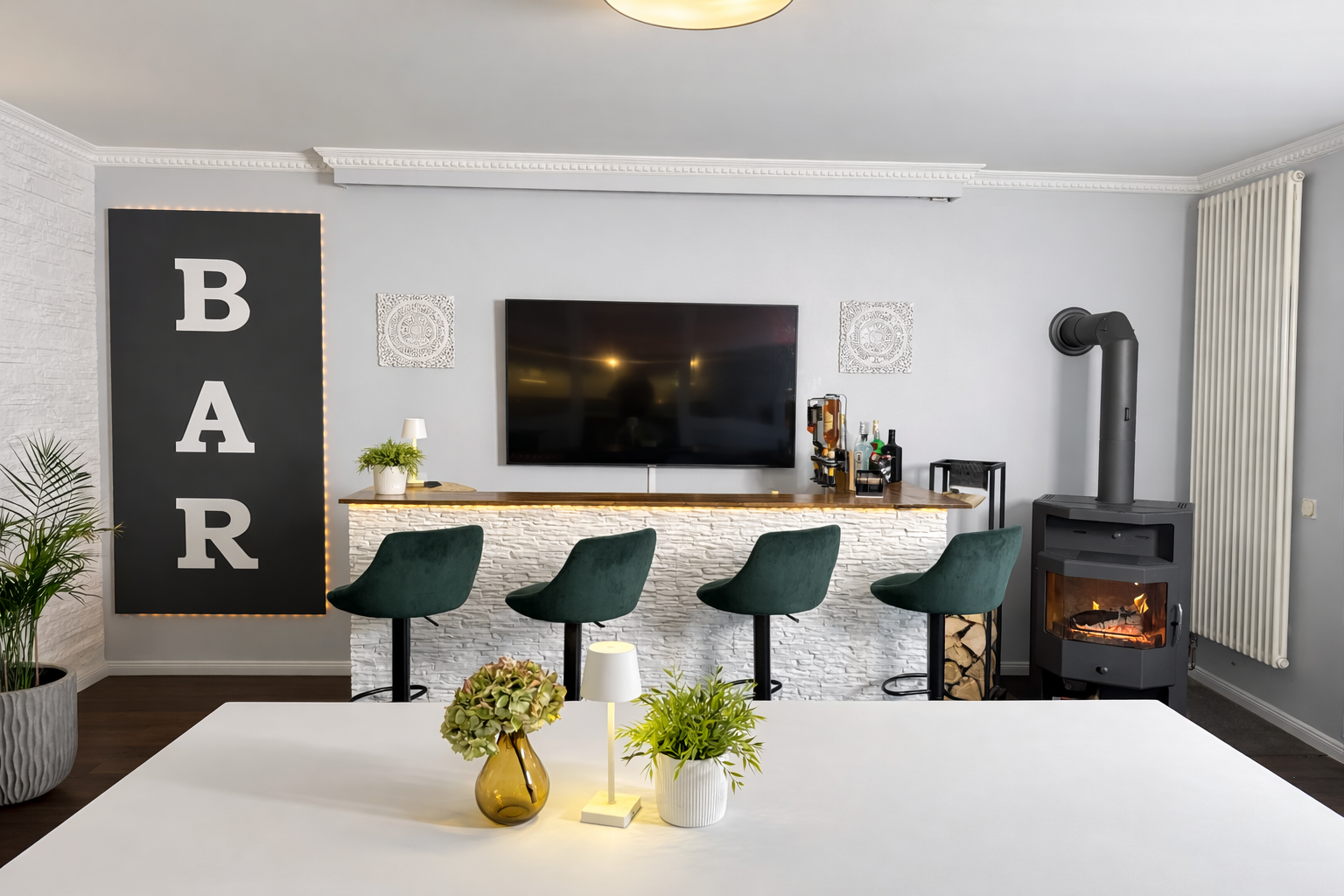 Diese Wohnung ist keine brave Adresse für Menschen, die sich irgendwie einrichten wollen. Sie ist für Menschen, die sagen: Wenn ich schon auf hohem Niveau wohne, dann bitte richtig. Hier wartet kein Standardgrundriss. Hier wartet ein Zuhause mit offener Küche, riesigem Wohnbereich, Bar, Billard, Dart, zwei Bädern, zwei Balkonen und Platz für alles, was nach einem langen Berliner Arbeitstag wirklich zählt: ankommen, durchatmen, Freunde einladen, Wein aufmachen, Musik an, Billardkugeln rollen lassen, Barlicht an, draußen Natur, drinnen Atmosphäre.