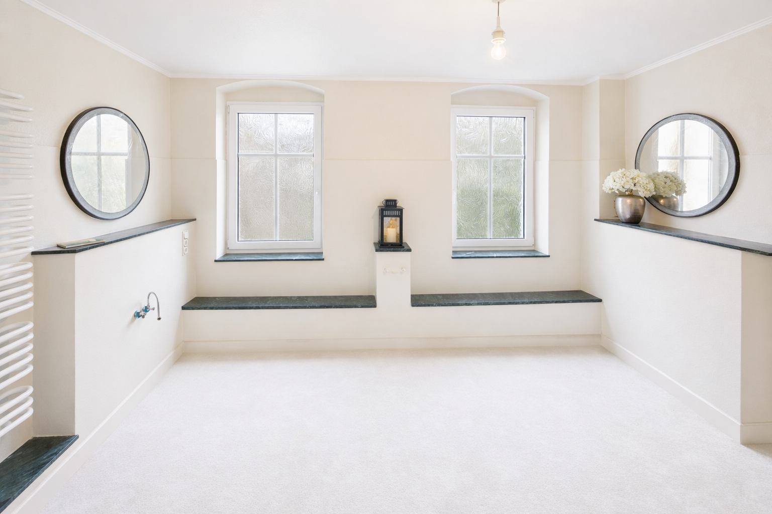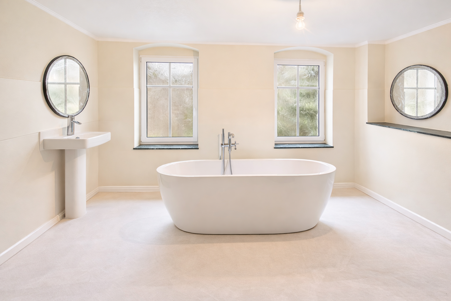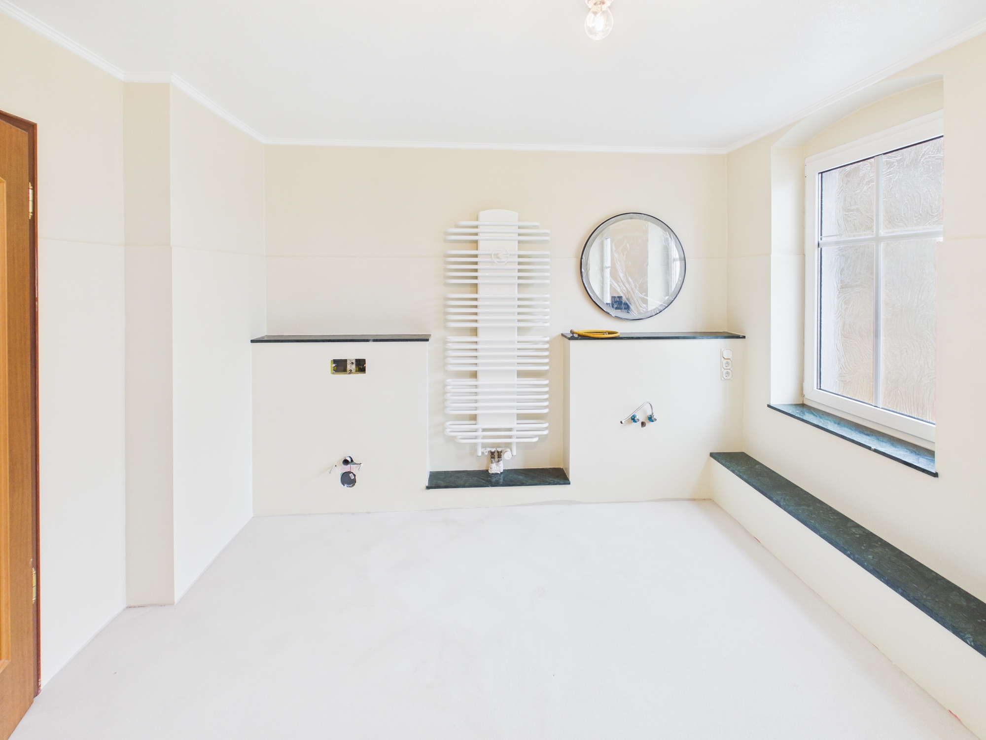 Hauptbad ist in weiten Teilen zur Fertigstellung vorbereitet. Freistehende Badewanne, WC, Waschbecken vorhanden. Kostengünstige Firmenempfehlung zur eigenen Fertigstellung können bei Bedarf gern durch uns zur Verfügung gestellt werden.