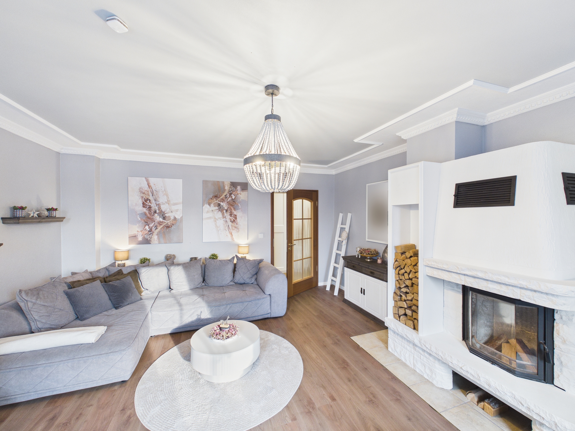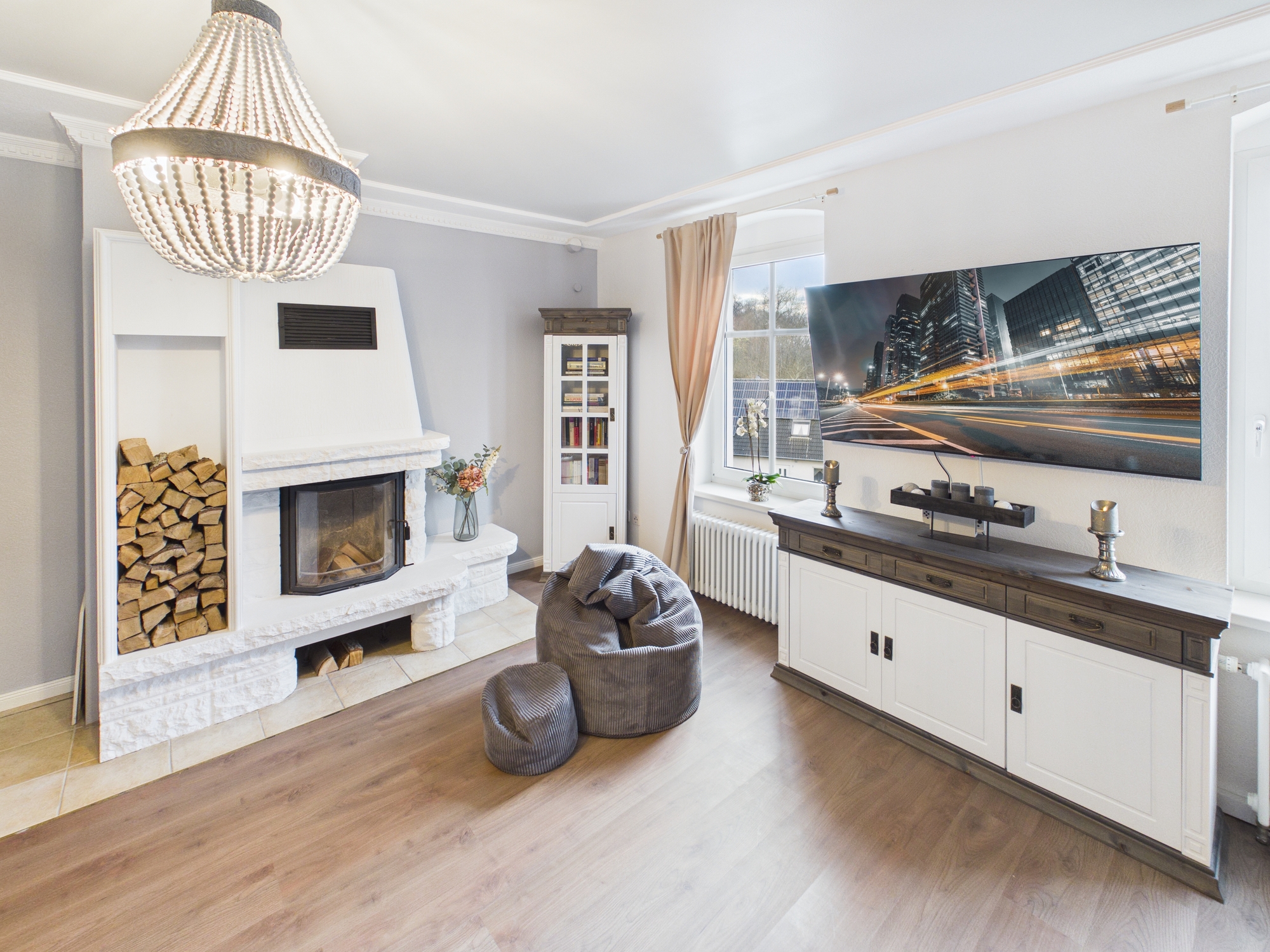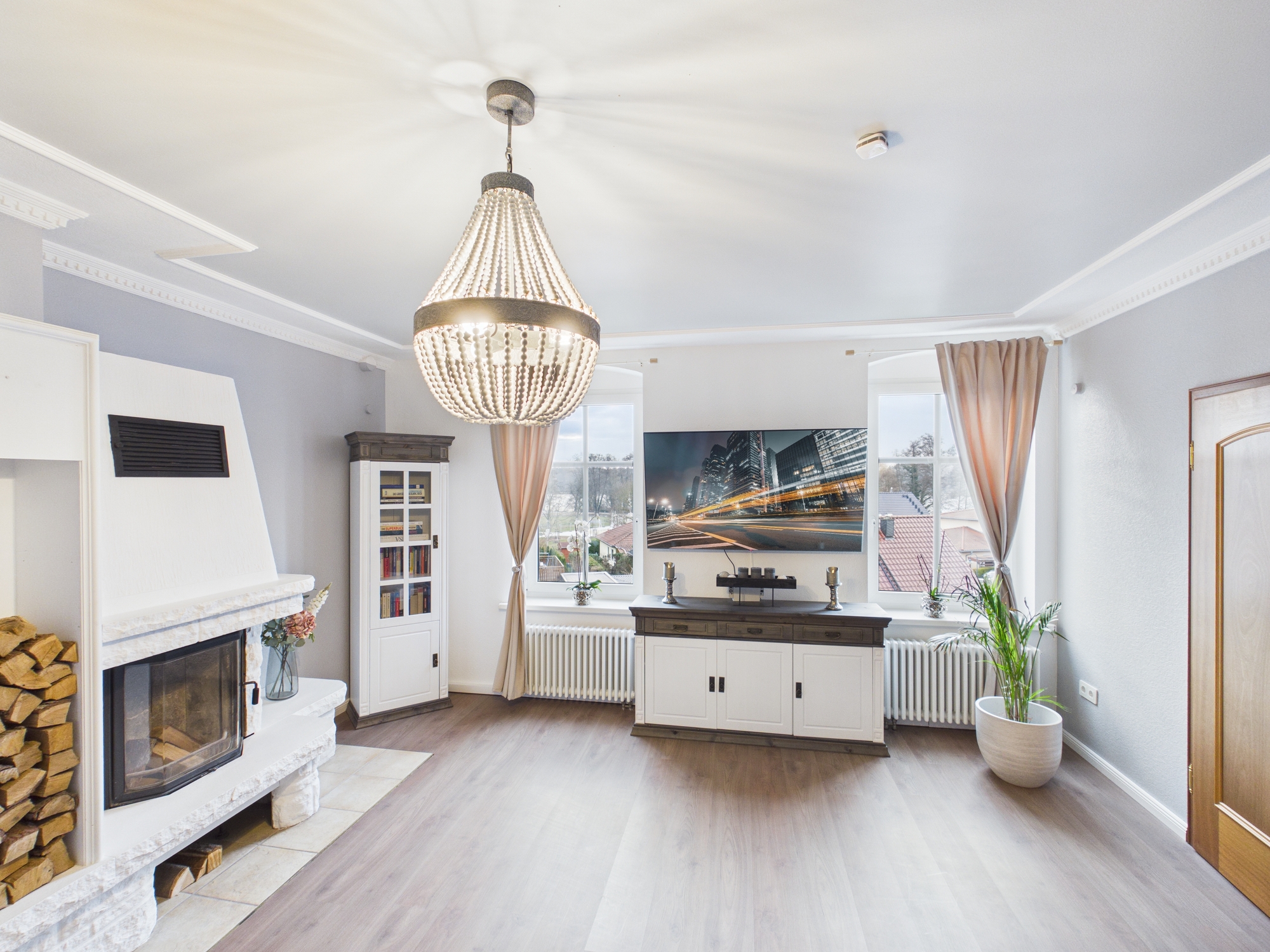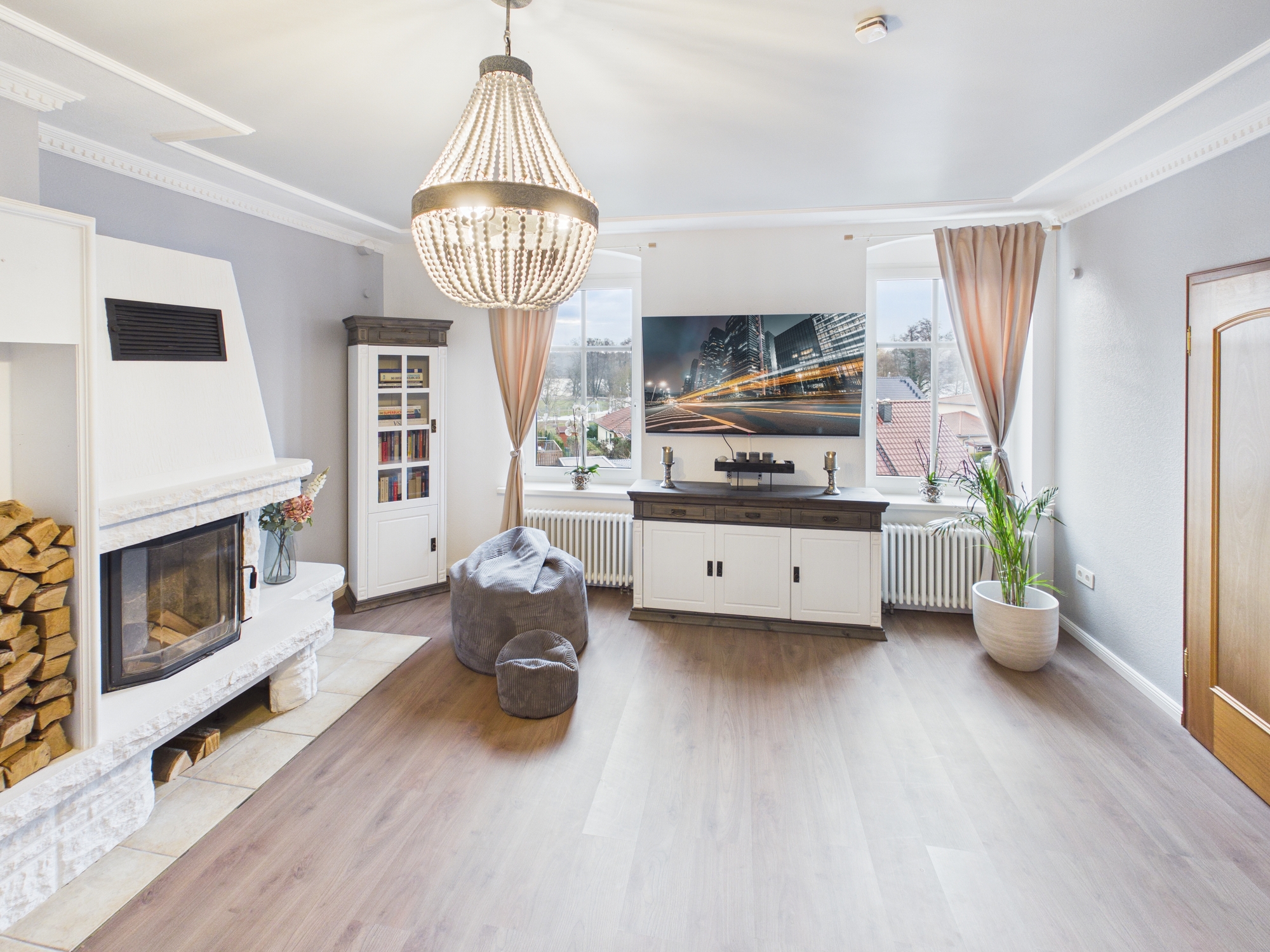 Der offene Wohn- und Essbereich ist kein Raum, sondern eine Ansage. Großzügig, hell, repräsentativ, mit Kamin, Balkon und einem Ausblick, der jedem Berliner sofort die Frage ins Hirn pflanzt: Warum wohne ich eigentlich noch so beengt?