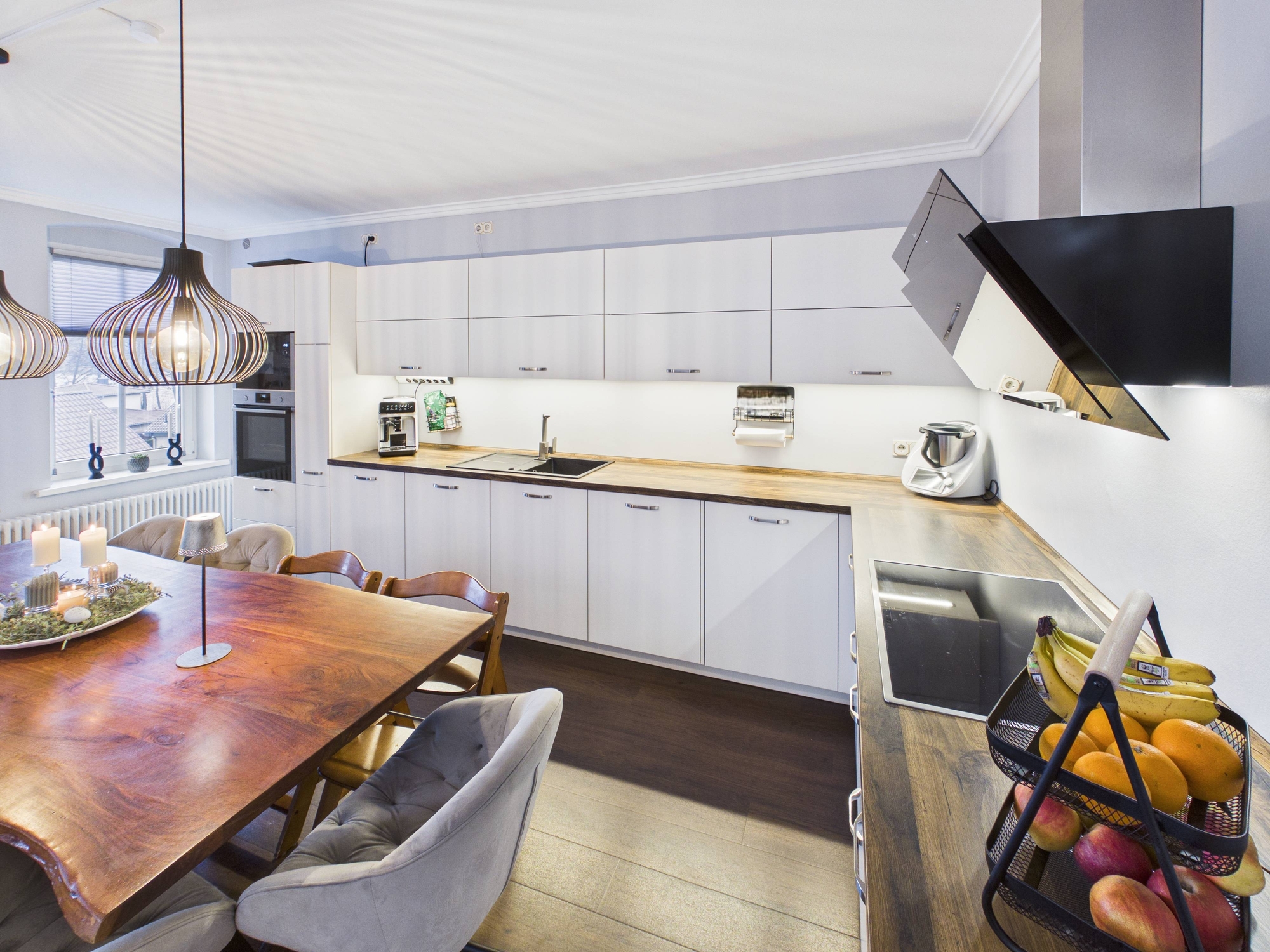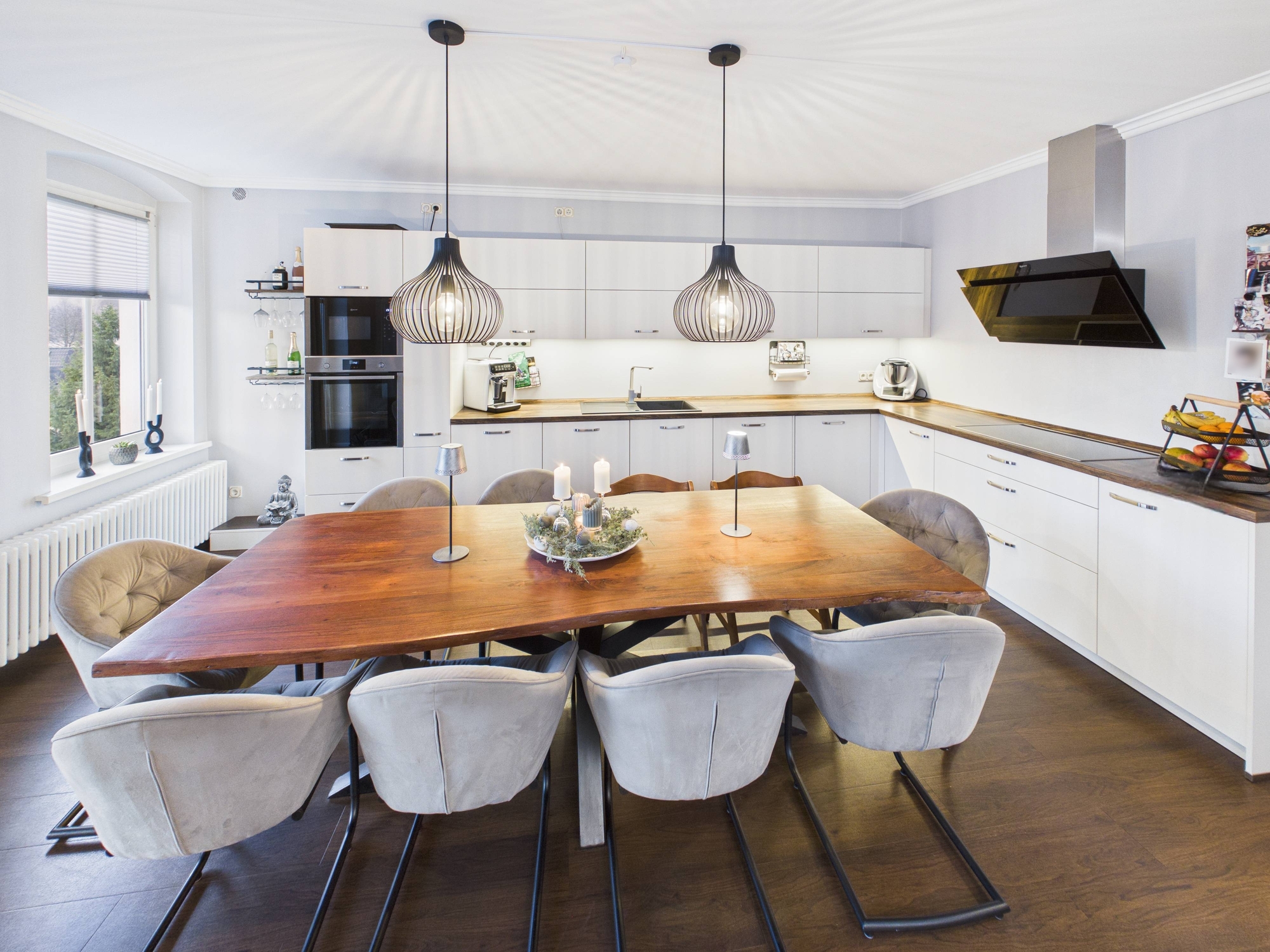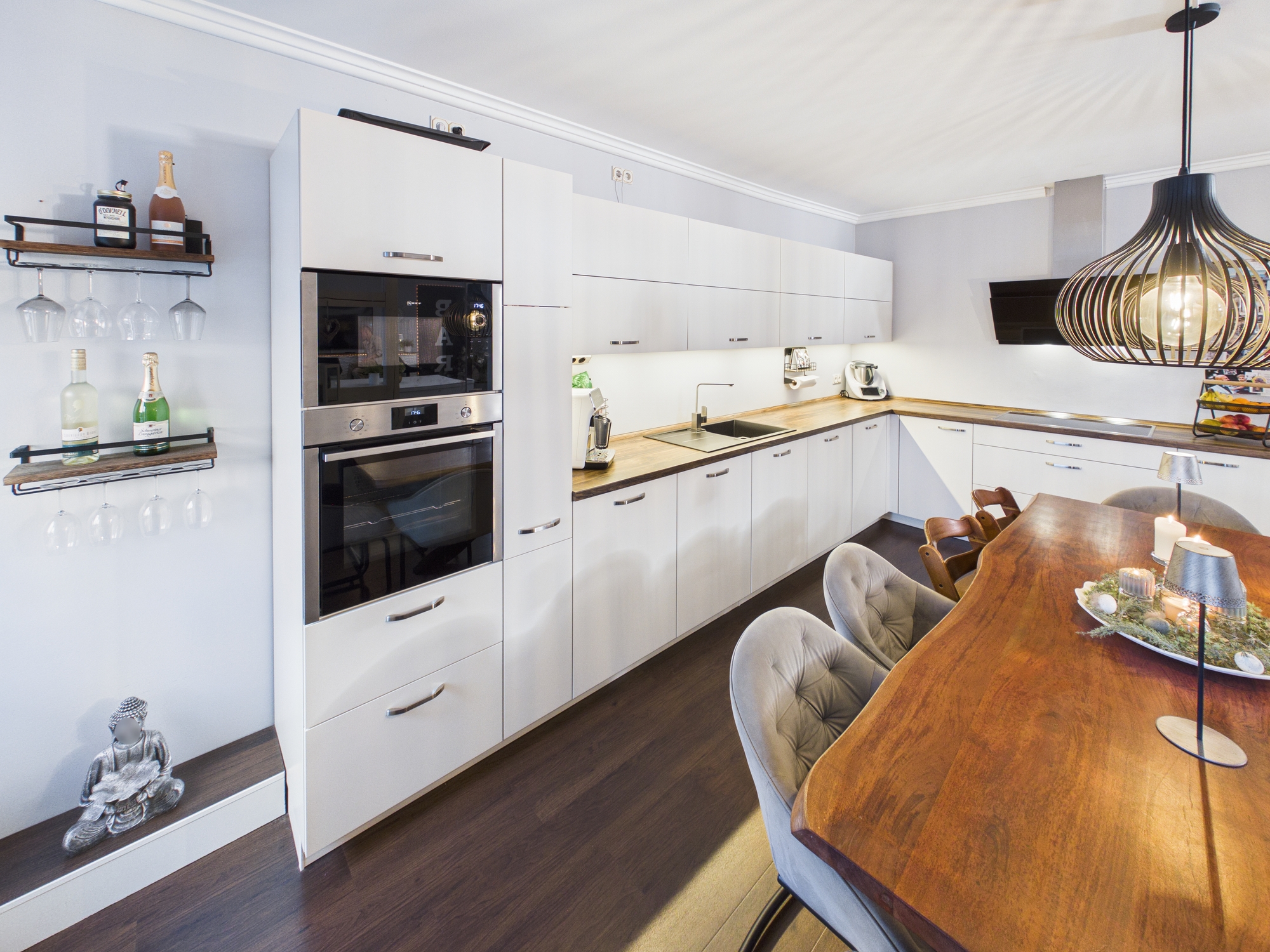 Die Küche ist offen und hochwertig eingebunden. Nicht abgetrennt, nicht kleinteilig, nicht spießig. Sondern genau so, wie man heute leben will: kommunikativ, stilvoll, erwachsen.
