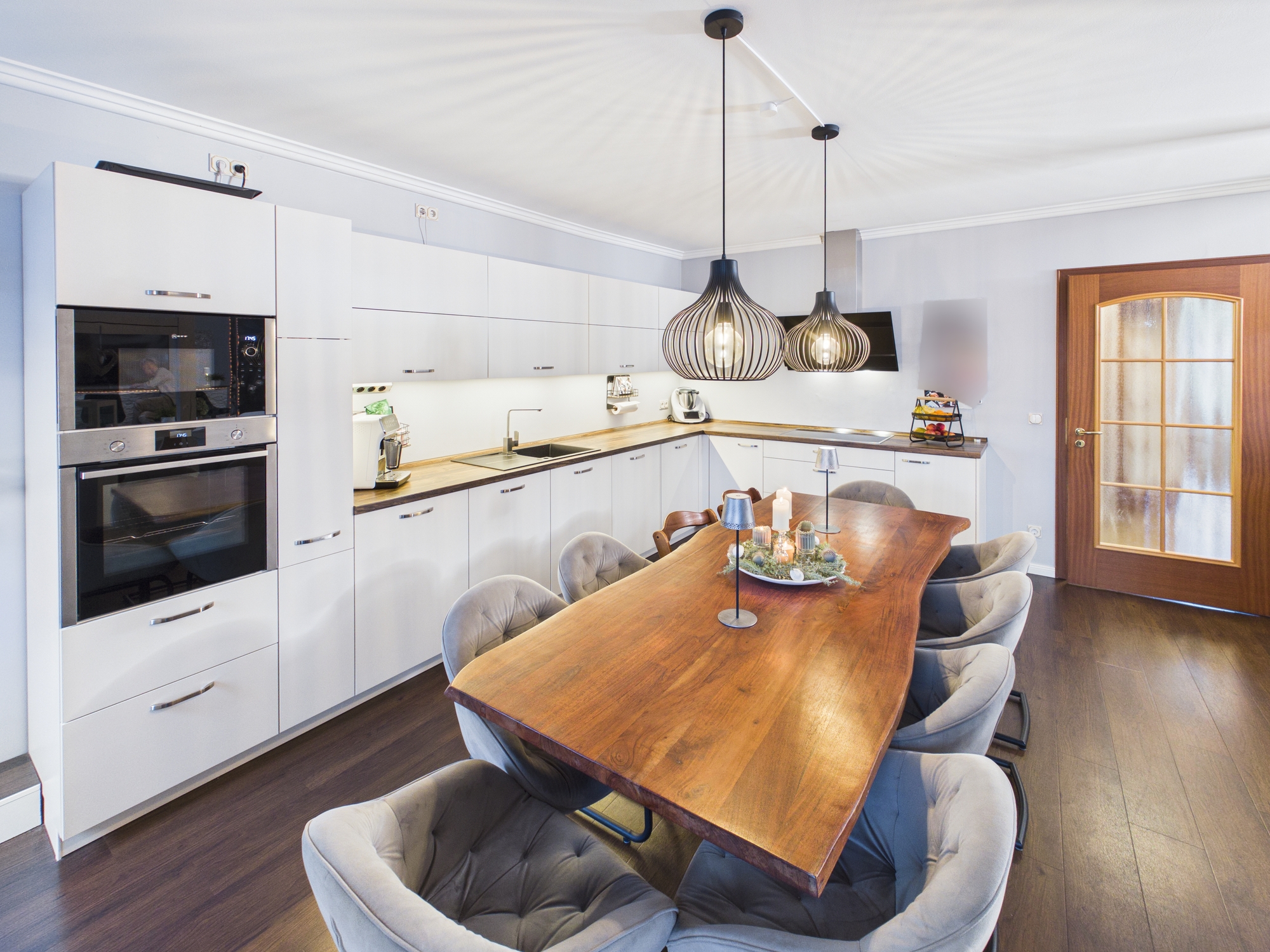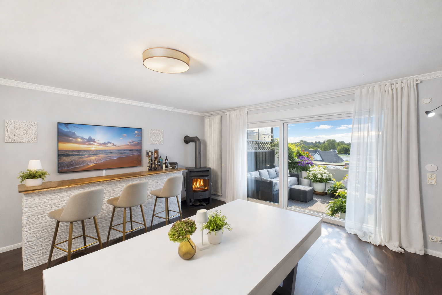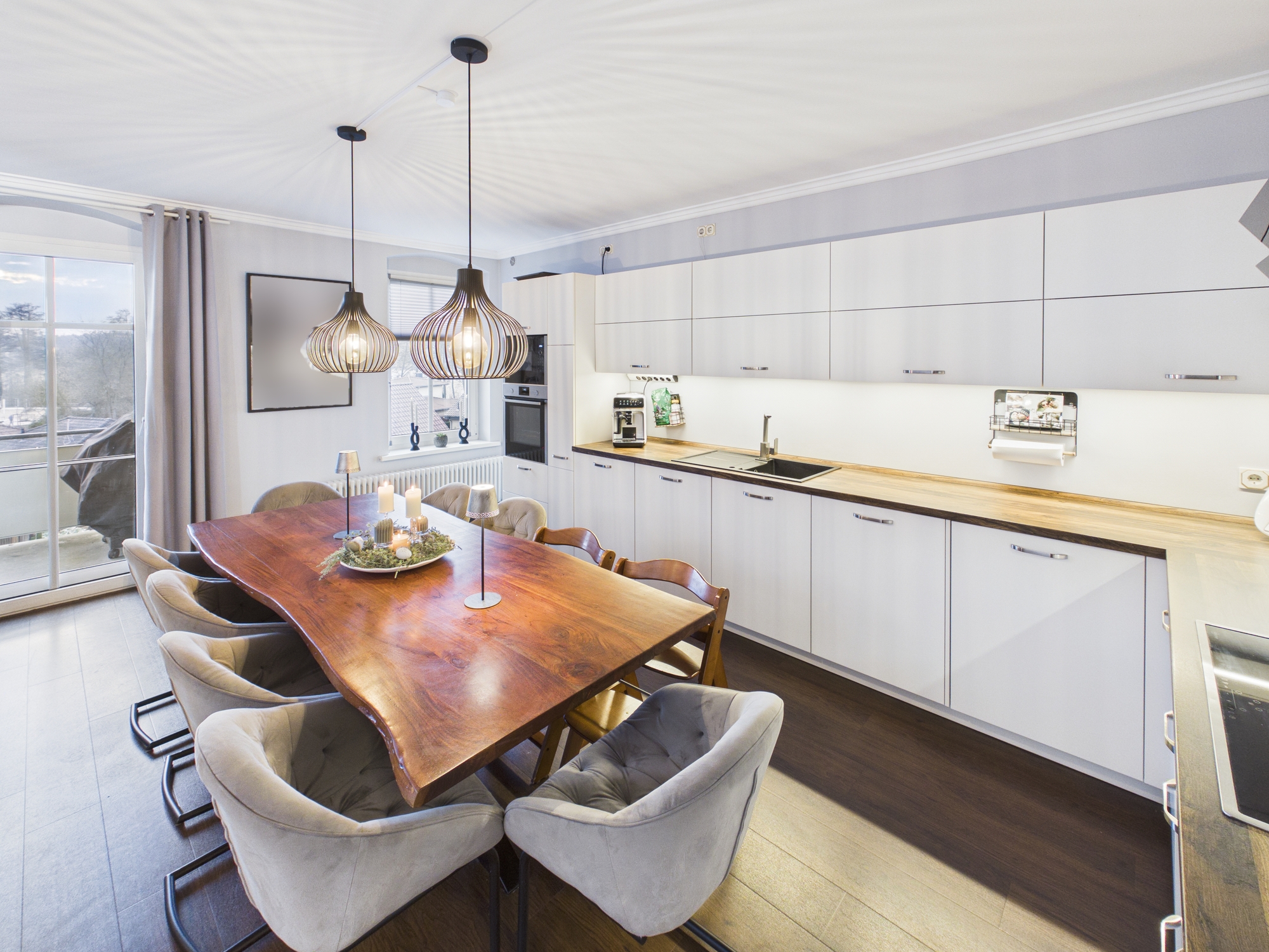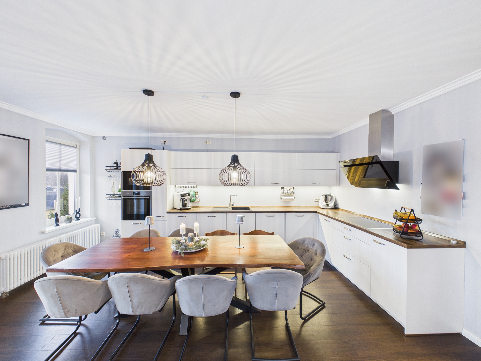 Die Küche ist offen und hochwertig eingebunden. Nicht abgetrennt, nicht kleinteilig, nicht spießig. Sondern genau so, wie man heute leben will: kommunikativ, stilvoll, erwachsen.