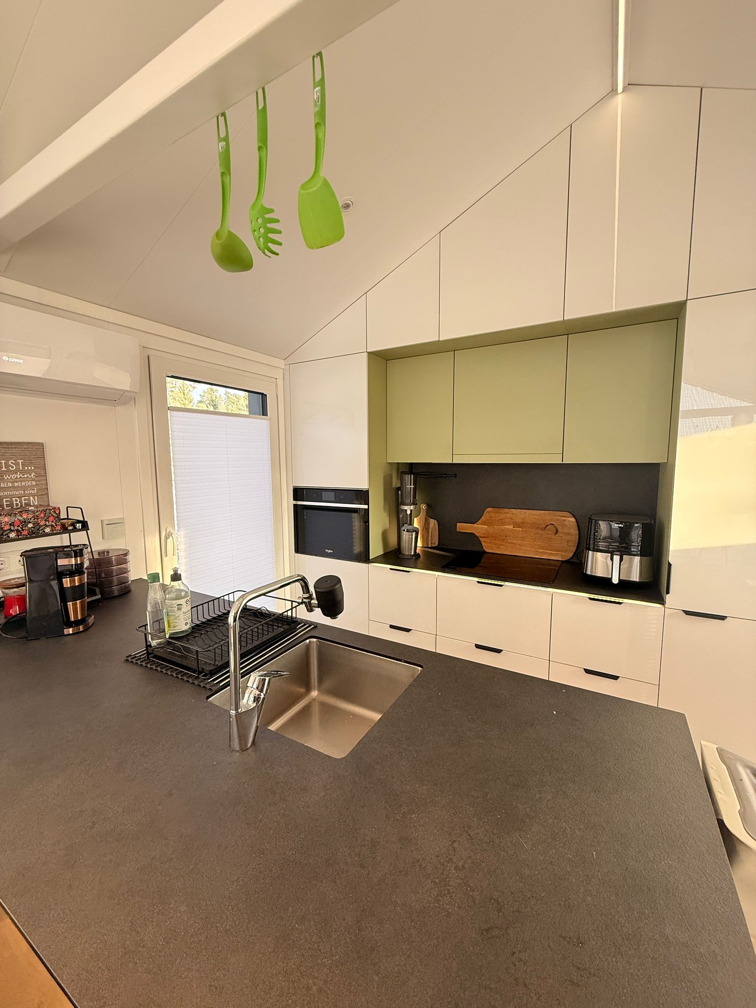 Induktion, Backofen, Mikrowelle, Heißluftfritteuse, Kaffeemaschine, großer Kühlschrank + Gefrierfach.