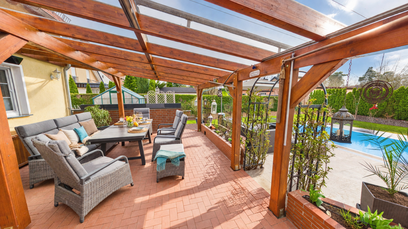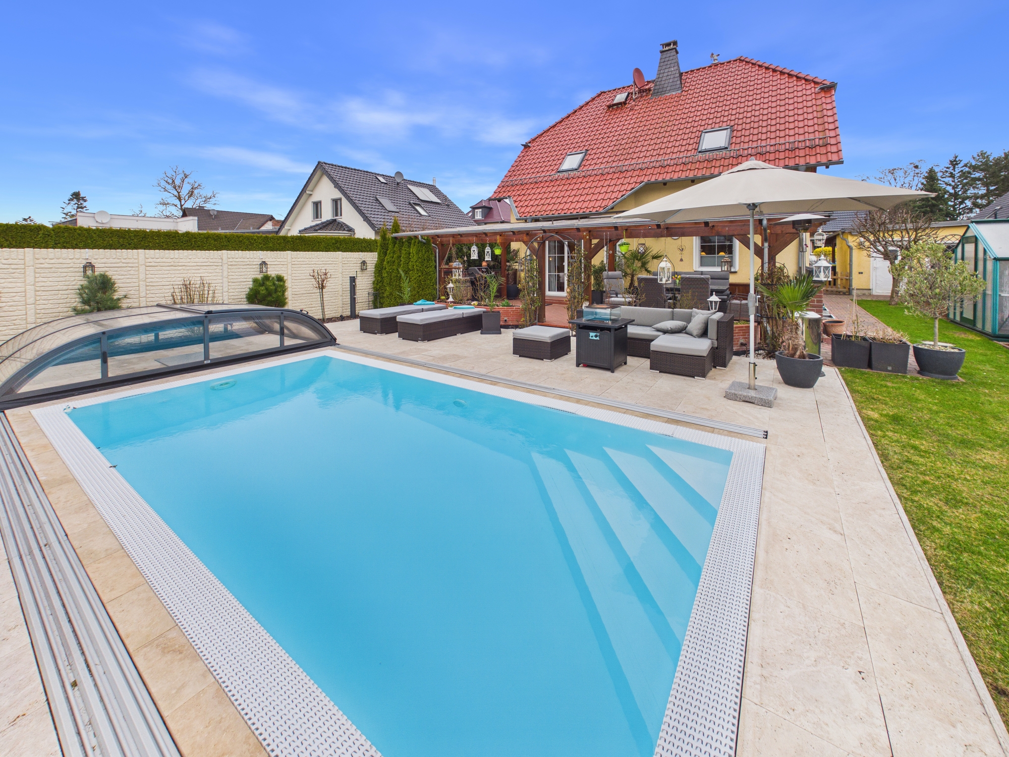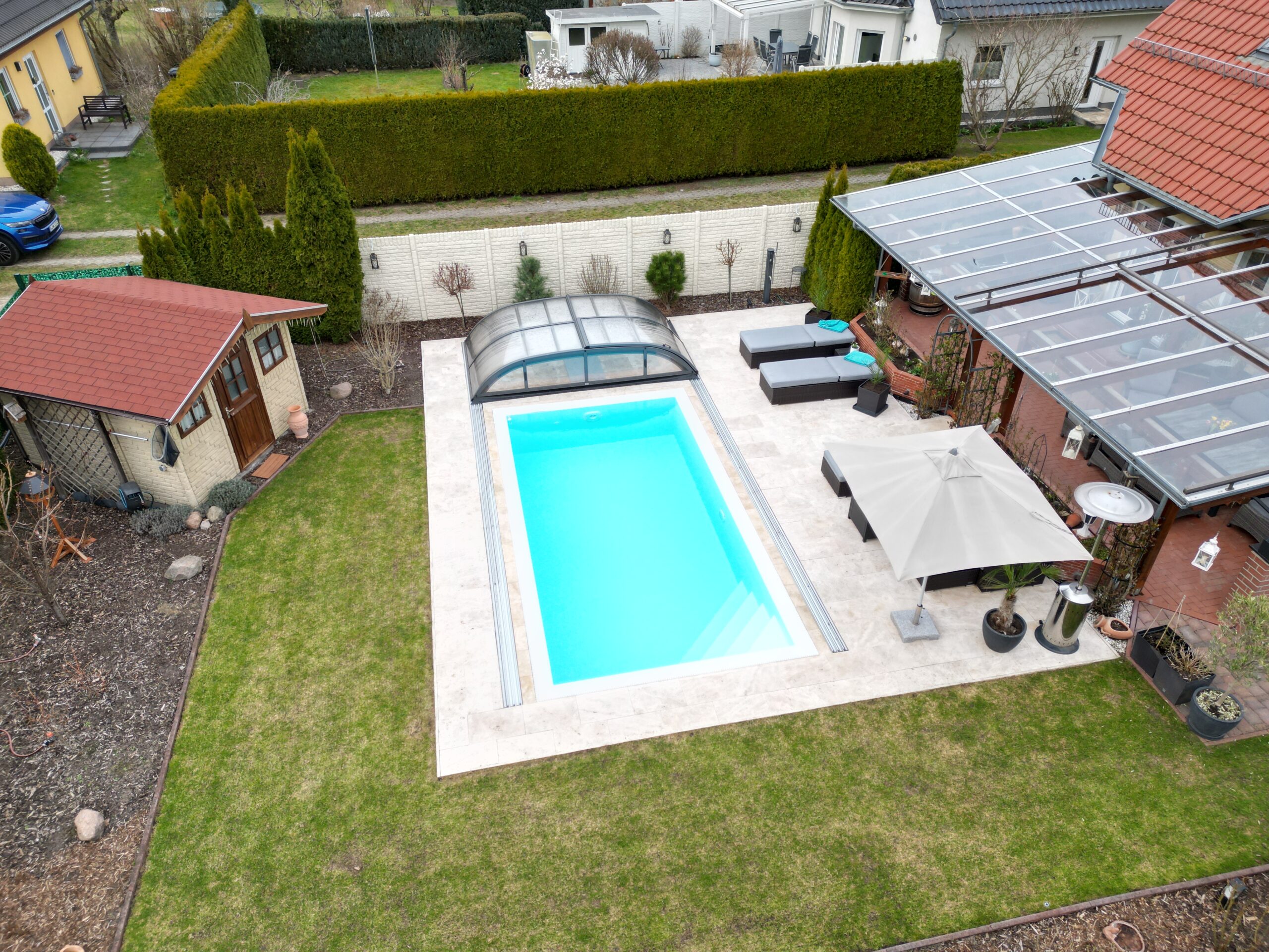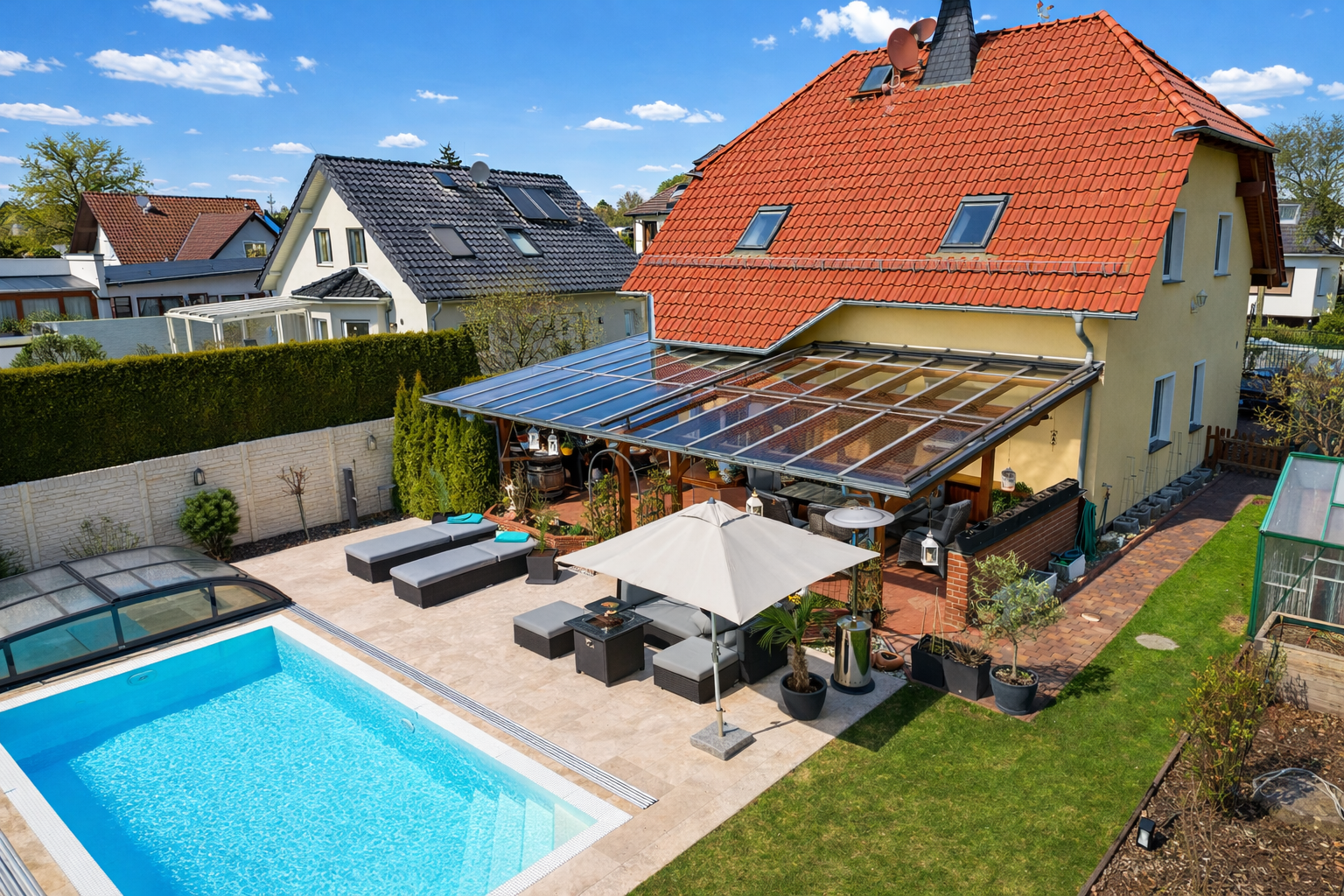 Ein echtes Highlight ist der liebevoll gestaltete Außenbereich. Die großzügige, mediterran anmutende Terrasse schafft den perfekten Rahmen für lange Sommerabende, gemeinsame Essen mit Freunden oder entspannte Stunden in der Sonne. Dazu kommt ein beheizbarer Pool mit Gegenstromanlage, der den Alltag mit einem Hauch von Boutique-Resort veredelt und dem Zuhause eine besondere Qualität schenkt.
