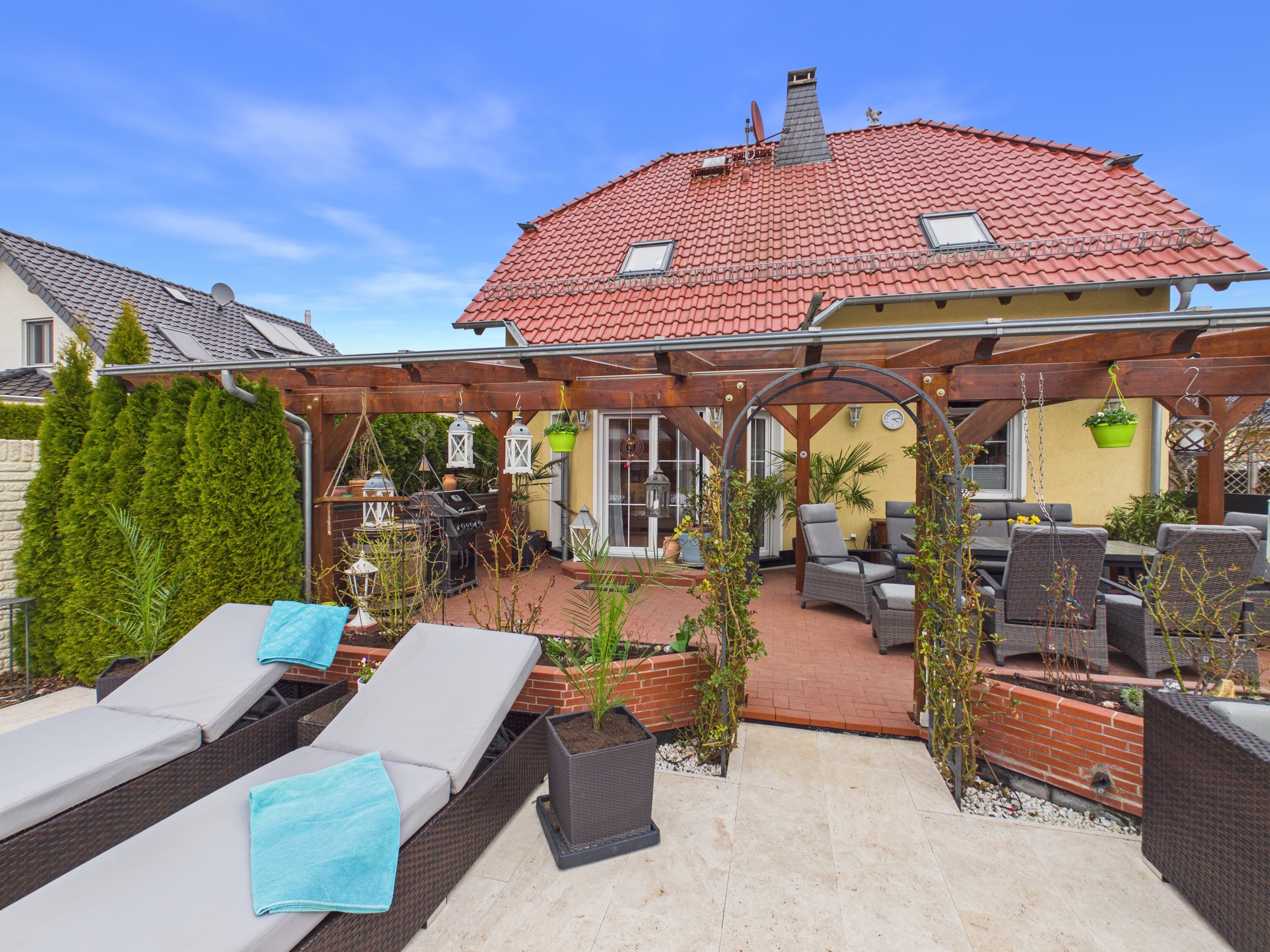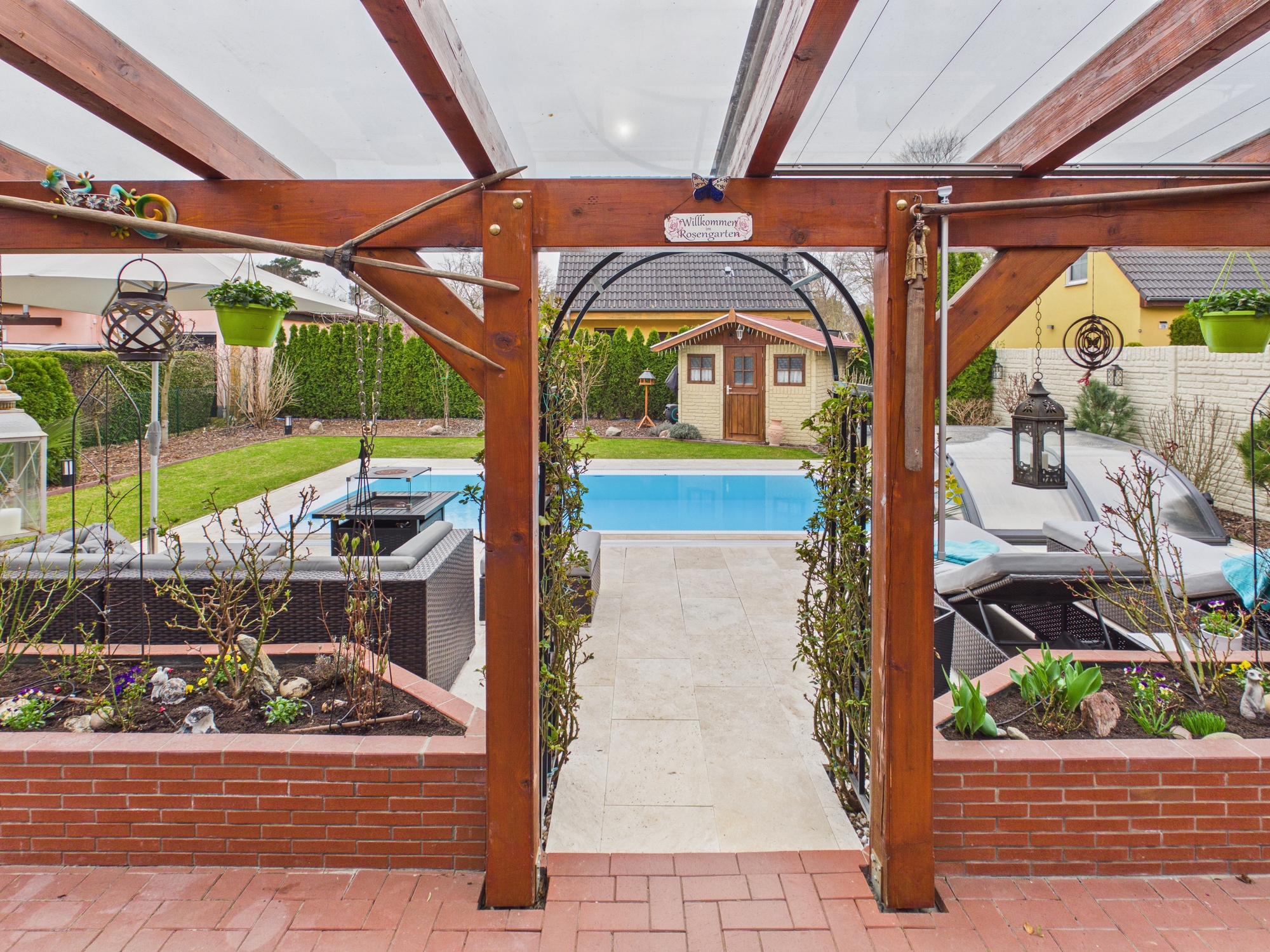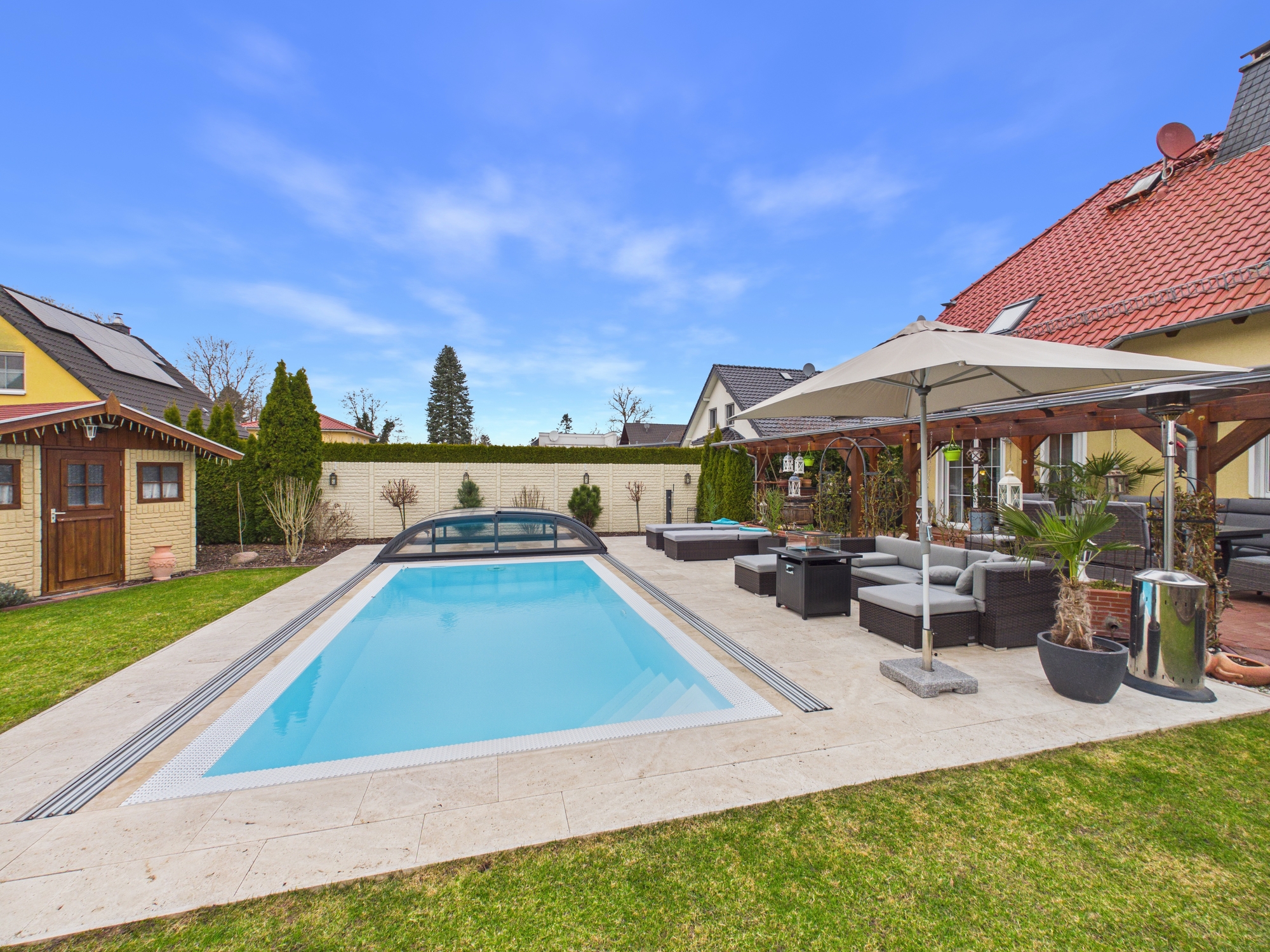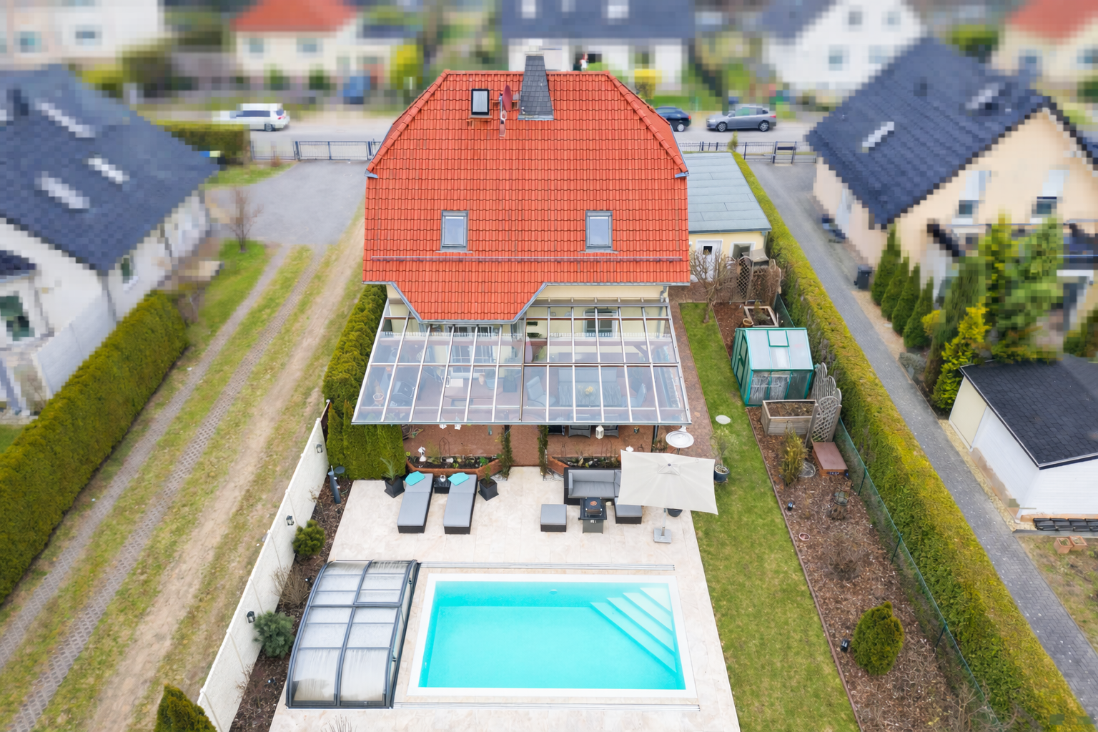 Ein echtes Highlight ist der liebevoll gestaltete Außenbereich. Die großzügige, mediterran anmutende Terrasse schafft den perfekten Rahmen für lange Sommerabende, gemeinsame Essen mit Freunden oder entspannte Stunden in der Sonne. Dazu kommt ein beheizbarer Pool mit Gegenstromanlage, der den Alltag mit einem Hauch von Boutique-Resort veredelt und dem Zuhause eine besondere Qualität schenkt.