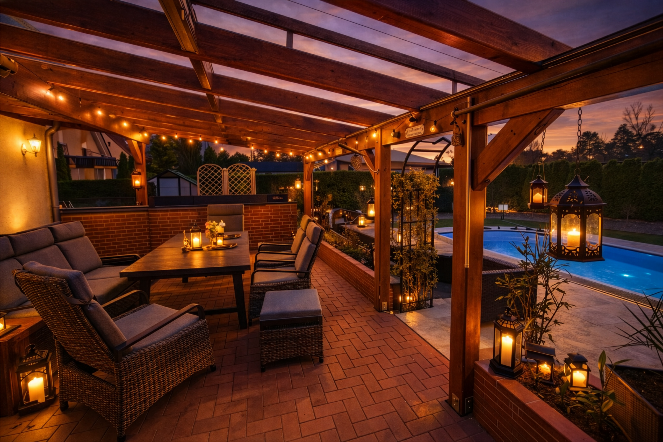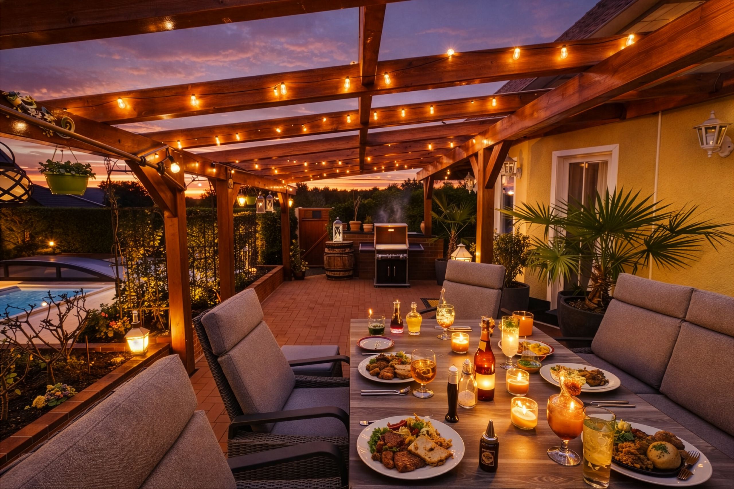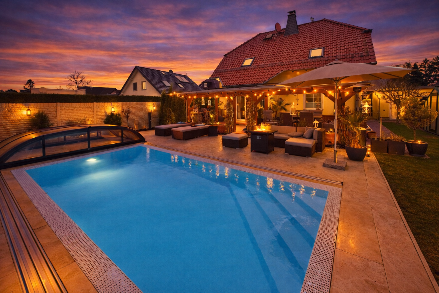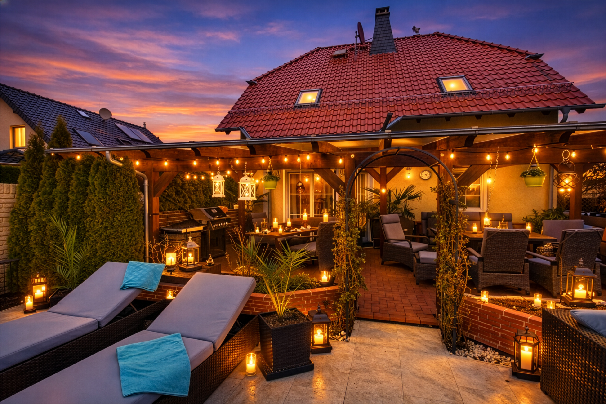 Ein echtes Highlight ist der liebevoll gestaltete Außenbereich. Die großzügige, mediterran anmutende Terrasse schafft den perfekten Rahmen für lange Sommerabende, gemeinsame Essen mit Freunden oder entspannte Stunden in der Sonne. Dazu kommt ein beheizbarer Pool mit Gegenstromanlage, der den Alltag mit einem Hauch von Boutique-Resort veredelt und dem Zuhause eine besondere Qualität schenkt.